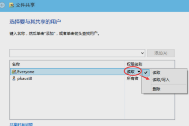 再次,选择“特定用户”的话这里最要注意哦,选择要共享的用户“everyone”,再点击旁