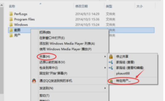 其次,点击这个要共享的文件夹,右键 选择“共享”按钮,然后再选择“特定用户”