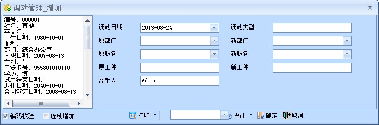 企业中人员较多,很多时候都会出现员工离职和员工入职的情况,同时员工有时候会晋升或者进行部门调动的场合,这些时候就需要使用到软件中的调动管理功能。通过调动管理功能来记录员工的工作的转移情况,便于企业日后进行相关的统计操作。