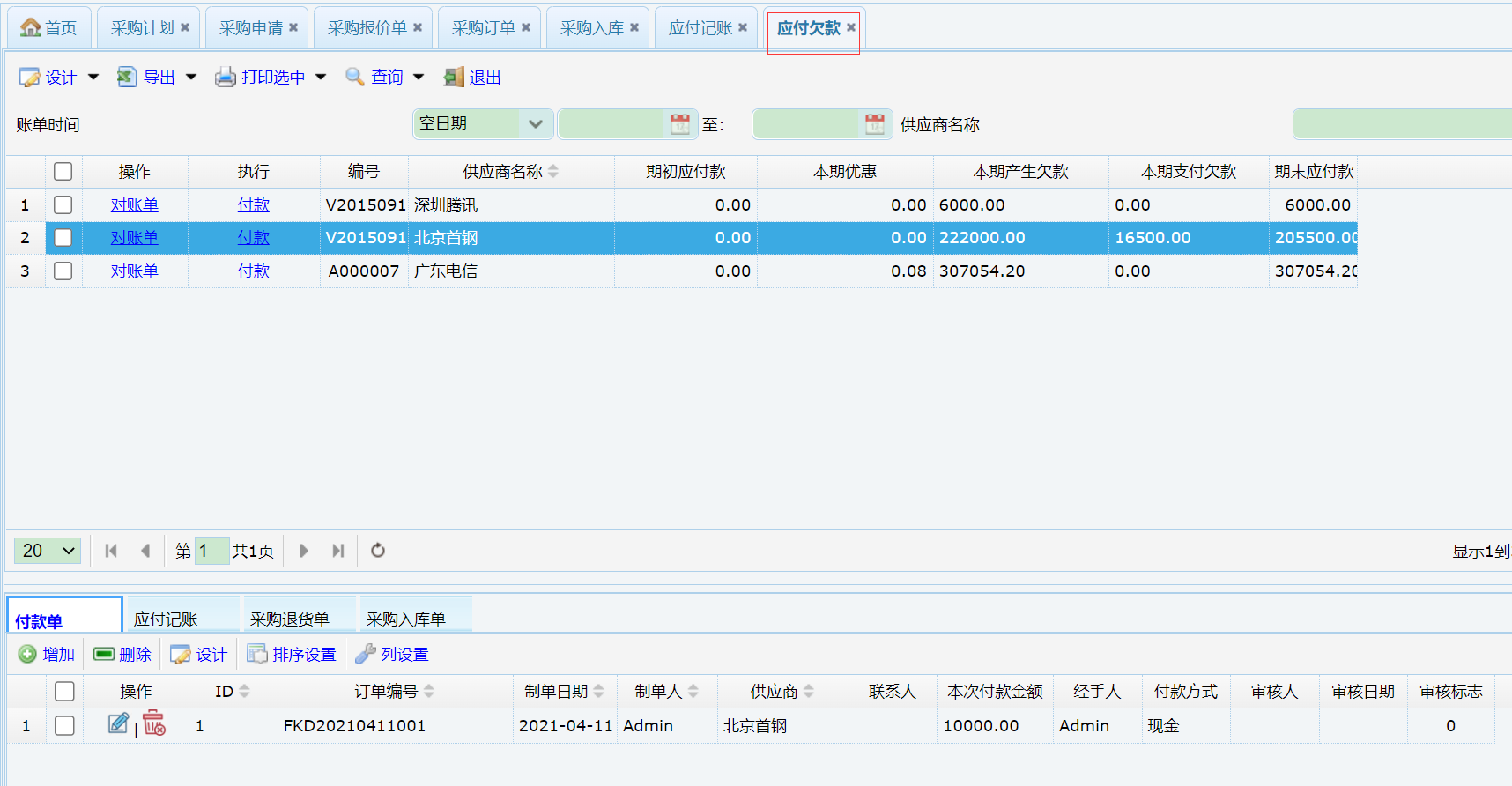 批单付款:可以对供应商某一端时间欠款进行批量付款。