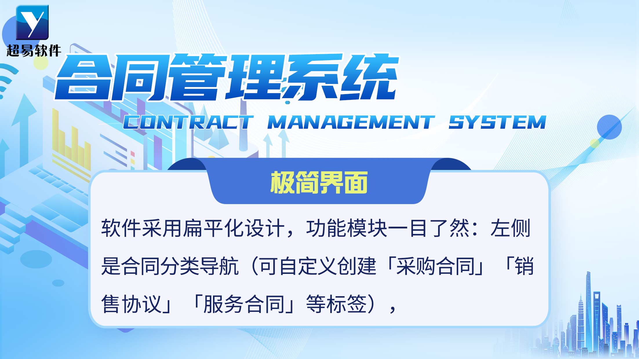 软件采用扁平化设计,功能模块一目了然:左侧是合同分类导航(可自定义创建「采购合同」「销售协议」「服务合同」等标签),右侧直接呈现合同列表,常用操作(新增、编辑、查询、导出)以图标形式排列,即使是电脑新手也能 5 分钟内熟悉操作流程。没有复杂的菜单嵌套,所有功能直达,告别「学习成本焦虑」。