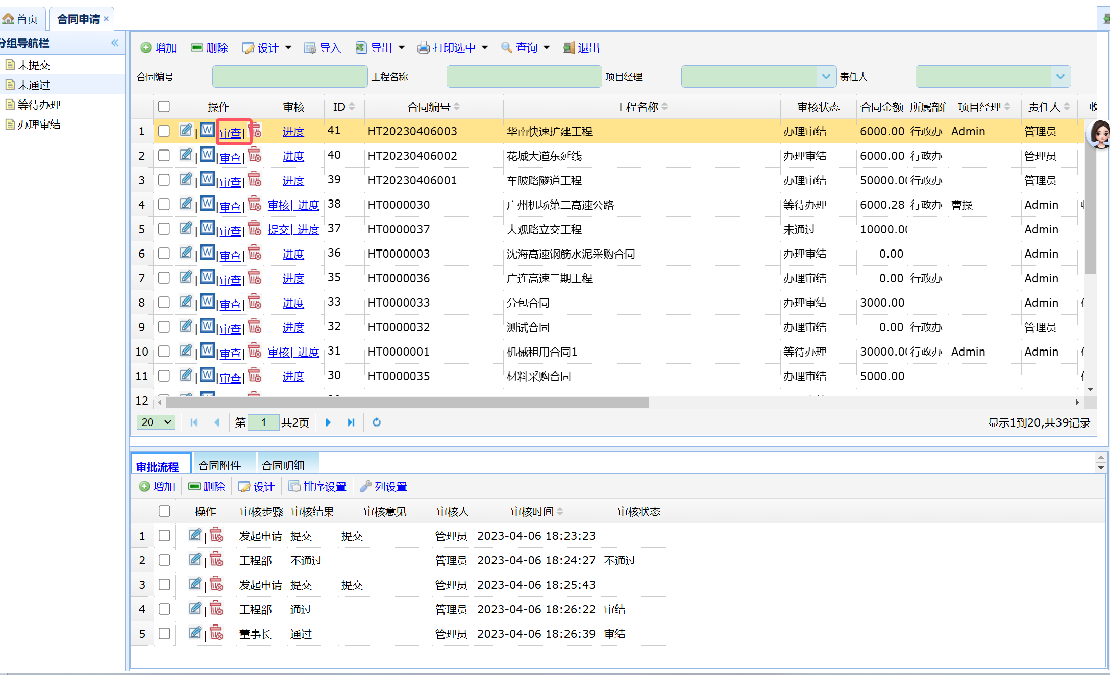 存量合同调用:直接在系统合同库中筛选目标合同 —— 通过 “合同编号、工程名称、审核状态” 等多维度查询,或在 “未提交、等待办理、办理审结” 等状态分组中快速定位,选中后即可启动审查,无需重复上传。
