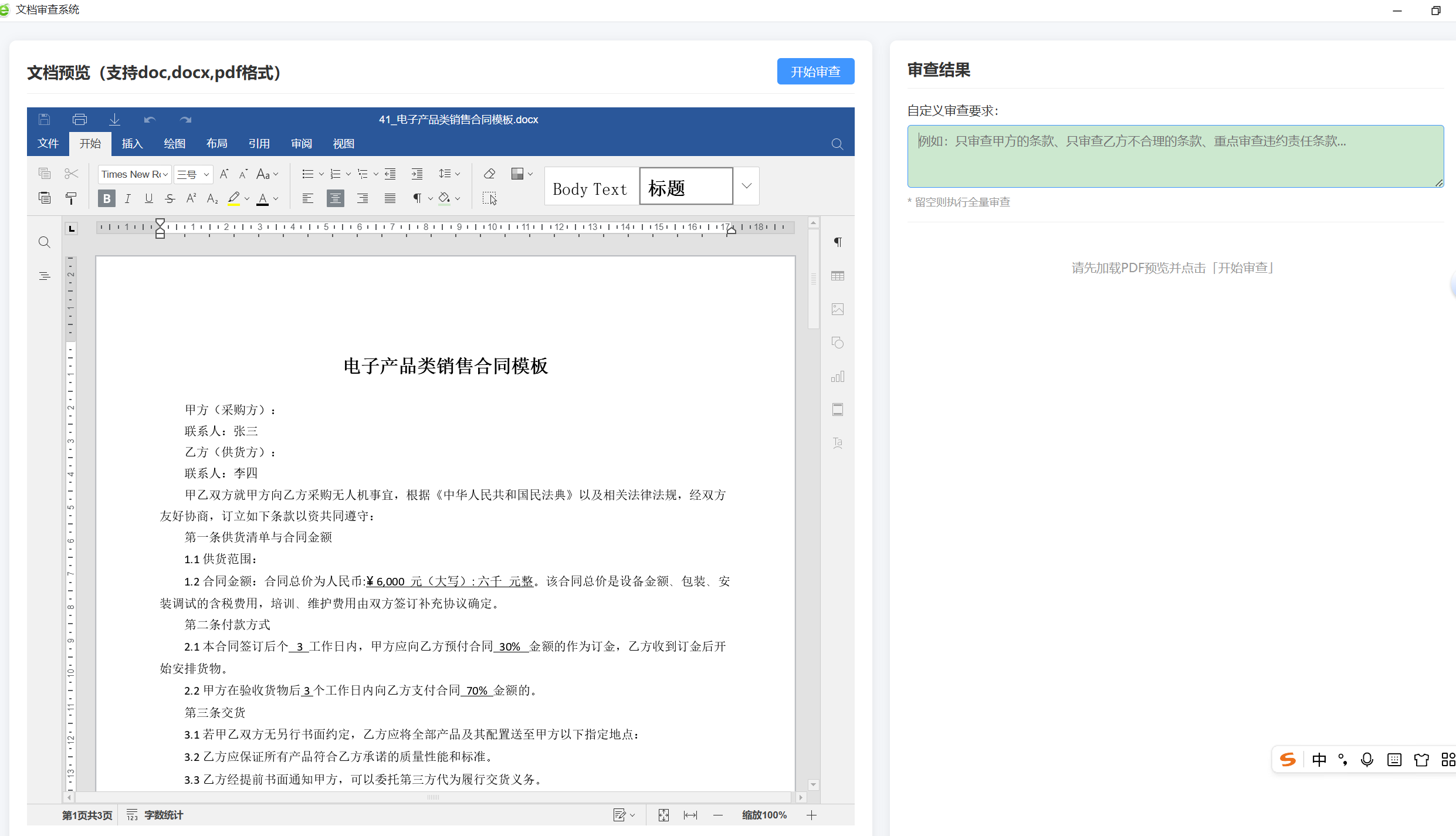 可切换 “甲方(采购方 / 供货方)、乙方、第三方” 等审查立场,从不同视角拆解合同风险。例如: