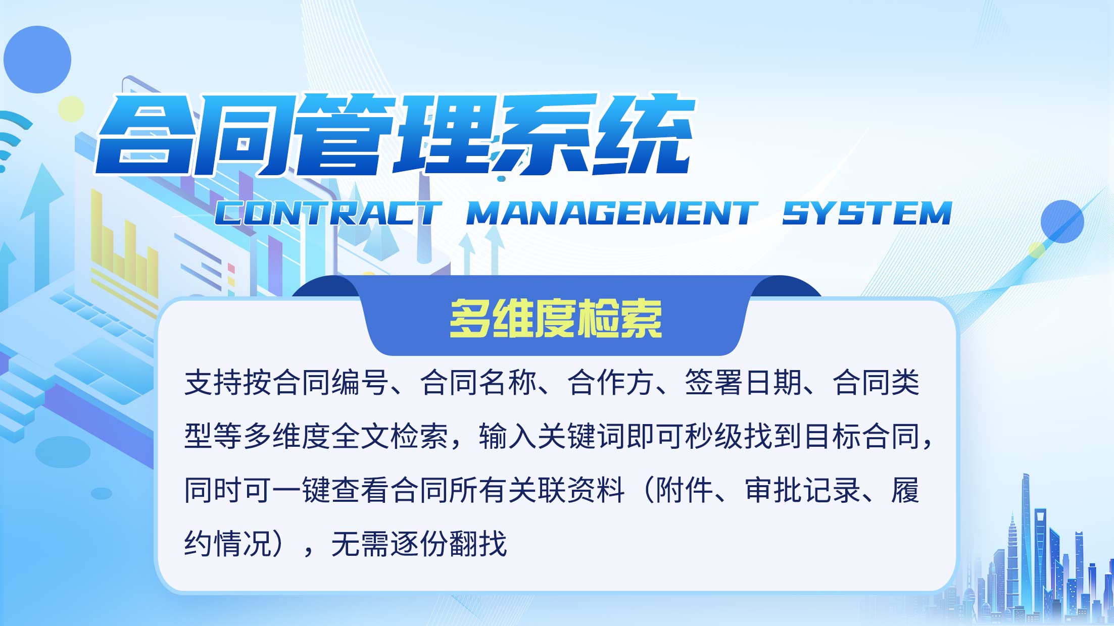 多维度检索,秒级定位目标:支持按合同编号、合同名称、合作方、签署日期、合同类型等多维度全文检索,输入关键词即可秒级找到目标合同,同时可一键查看合同所有关联资料(附件、审批记录、履约情况),无需逐份翻找,大幅提升检索效率,解决“找合同难”的核心痛点。